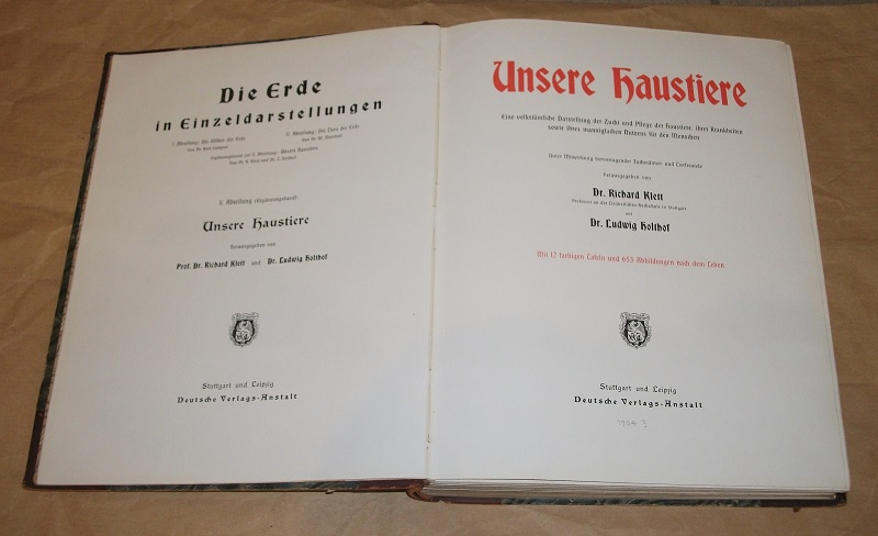Klett, Dr. Richard u. Dr. Ludwig Holthof (Hrsg.): Unsere Haustiere. Eine volkstümliche Darstellung der Zucht und Pflege der Haustiere, ihrer Krankheiten sowie ihres mannigfachen Nutzens für den Menschen. Stuttgart u. Leipzig: Deutsche Verlags-Anstalt o.J. (ca. 1900) 28 cm, XVI, 399 S. mit 12 farb. Tafeln und 653 Abb. nach dem Leben. Altdeutsche Schrift. HLdr. Leder stark berieben, Kanten berieben, Ecken bestoßen, Schnitt gebräunt u. angeschmutzt / fleckig.