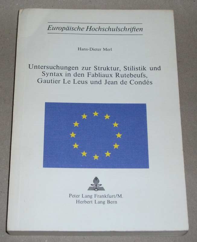 Merl, Hans-Dieter: Untersuchungen zur Struktur, Stilistik und Syntax in den Fabliaux Rutebeufs, Gautier Le Leus und Jean de Condés. Frankfurt/M./Bern: Lang, 1976. 21 cm. II, 368 S. Kart. Einband und Schnitt stockfleckig und gebräunt.Obere Ecke etw. gestaucht. Europäische Hochschulschriften : Reihe 13, Französische Sprache und Literatur ; Bd. 40.