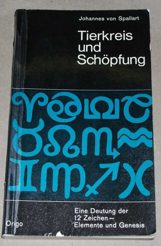 Spallart, Johannes von: Tierkreis und Schöpfung. Eine Deutung der 12 Zeichen – Elemente und Genesis. 1. Aufl. Zürich: Origo 1965 20 cm, 191 S. mit Ill. + 1 herausklappbaren Tafel. TB. Einband mit Knickspuren, Folienkaschierung fängt an sich zu lösen. Ecken u. Kanten bestoßen.