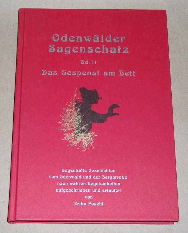 Pöschl, Erika: Odenwälder Sagenschatz Bd. 2.: Das Gespenst am Bett. Sagenhafte Geschichten vom Odenwald und der Bergstraße, nach wahren Begebenheiten aufgeschrieben und erläutert. Ober-Ramstadt/Rohrbach: Pöschl, 1998. 22,5 cm, 176 S. : Ill. Pp. Leichte Gebrauchsspuren. Mit Widmung der Autorin im Vorsatz.