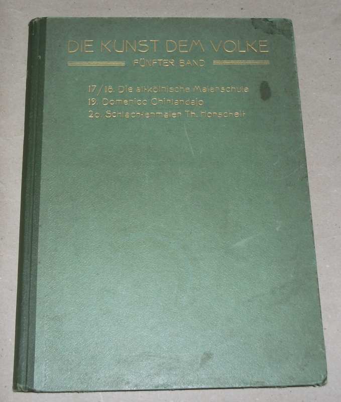 Die Kunst dem Volke fünfter [V.] Band. Enthält: 17 / 18. Die altkölnische Malerschule von Dr. Andreas Huppertz, Köln mit 103 Abb. ; 19. Domenico Chirlandajo von Dr. WalterBombe, mit 53 Abb. ; 20. Schlachtenmaler Th. Horschelt von Dr. Hyazinth Holland, mit 64 Abb. Erstes bis zwanzigstes Tsd. 3 Bände in einem. München: Allgemeine Vereinigung für christliche Kunst 1914 29 cm, 76 / 40 / 44 S. mit Abb., altdeutsche Schrift. HLn. Einband fleckig u. etw. berieben, Ecken bestoßen. Schnitt etw. fleckig. Innen sauber und gut erhalten.