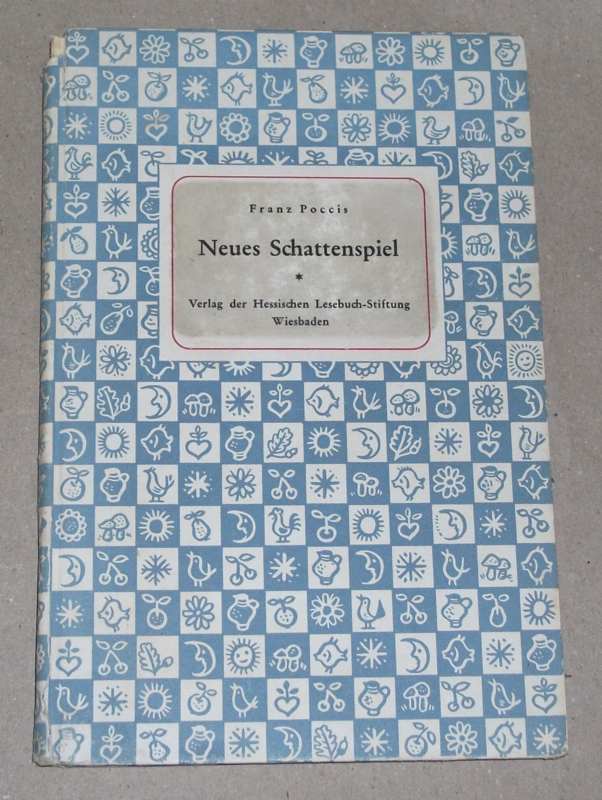 Poccis, Franz: Neues Schattenspiel. Mit Begleitworten von Olga Stückrath-Stawitz. Wiesbaden: Hessische Lesebuch-Stiftung 1953 18,5 cm, 63 (5) S. mit Ill. Pp. Rücken an den Kapitalen beschädigt, Ecken bestoßen. Einband vorne fleckig.Schnitt gebräunt, Widmung a. V., letzte S. mit Randeinriss.