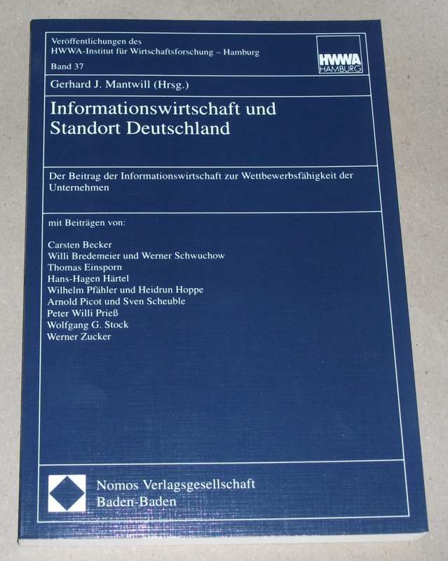 Mantwill, Gerhard [Hrsg.] / Becker, Carsten: Informationswirtschaft und Standort Deutschland. Der Beitrag der Informationswirtschaft zur Wettbewerbsfähigkeit der Unternehmen. 1. Aufl. Baden-Baden: Nomos-Verl.-Ges, 1997. 23 cm. 198 S., graph. Darst., Kt. flexibler Kunststoffeinband. Schnitt etw. angeschmutzt, sonst leichte Gebrauchsspuren. Veröffentlichungen des HWWA-Institut für Wirtschaftsforschung, Hamburg ; Bd. 37.