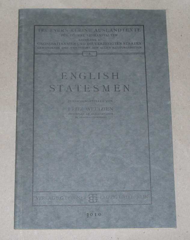 Weltzien, Fritz: English Statesmen. Leipzig: B. G. Teubner, 1926. 8. 32 S. Broschur. Schnitt gebräunt u. etw. fleckig, Stempel a. T. Sonst gut erhalten. Teubners kleine Auslandtexte für höhere Lehranstalten ; 8.