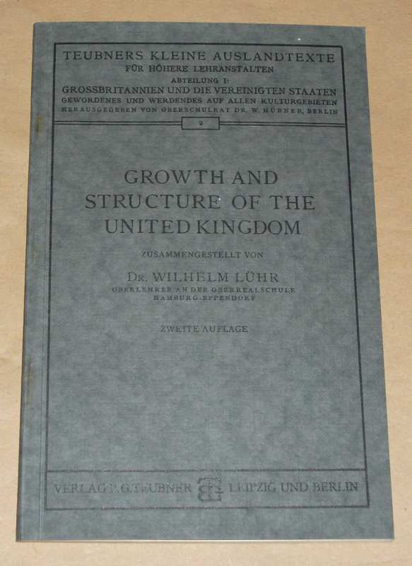 Lühr, Dr. Wilhelm: Growth and Structure of the United Kingdom. Leipzig: Teubner, o.J.. 19,5 cm, 48 S. Broschur. Ecken etw. bestoßen, Schnitt gebräunt, Stempel a. T. Gut erhalten. Teubners kleine Auslandtexte für höhere Lehranstalten; Abt. 1, Großbritannien und die Vereinigten Staaten, 2.