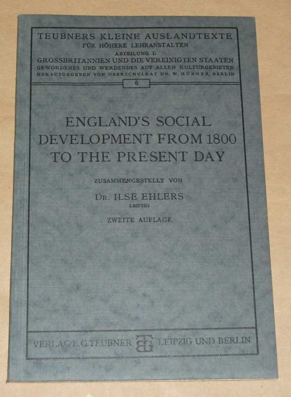 Ehlers, Dr. Ilse: England´s Social Development from 1800 to the present Day. Zweite Aufl. Leipzig: Teubner, o.J.. 19,5 cm, 48 S. Broschur. Schnitt gebräunt. Gut erhalten. Teubners kleine Auslandtexte für höhere Lehranstalten; Abt. 1, Großbritannien und die Vereinigten Staaten, 6.