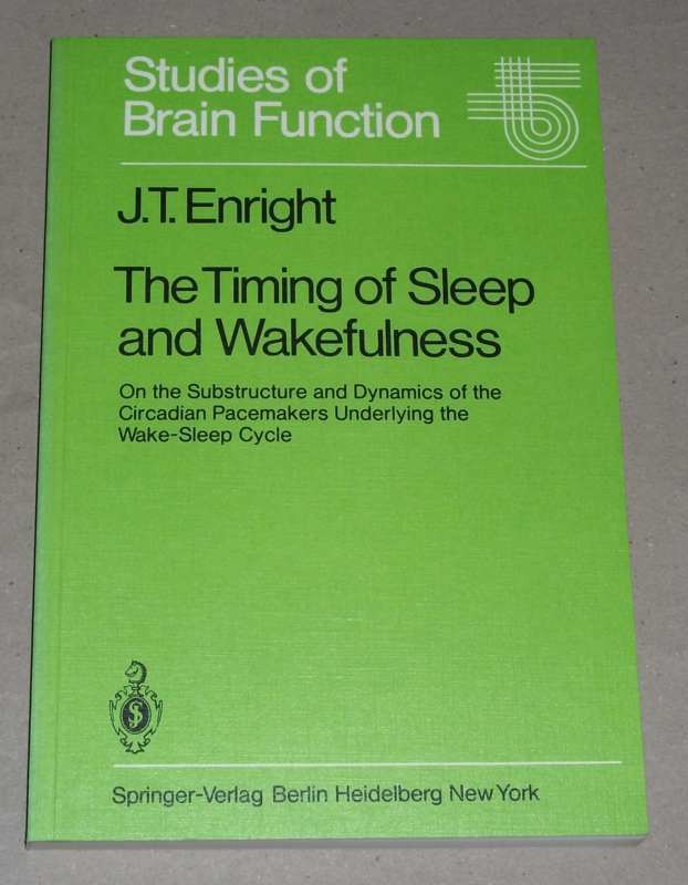 Enright, James T.: The timing of sleep and wakefulness. On the substructure and dynamics of the circadian pacemakers underlying in the wake-sleep cycle. Berlin, Heidelberg, New York: Springer, 1980. 25 cm. XVIII, 263 S., 103 graph. Darst. Kart. Leichte Gebrauchsspuren. Schnitt etw. angestaubt. Studies of brain function ; vol. 3. Literaturverz. S. 253 – 257.