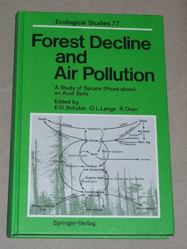Schulze, Ernst-Detlef [Hrsg.]: Forest decline and air pollution. A study of spruce (Picea abies) on acid soils. Berlin/Heidelberg/New York/London/Paris/Tokyo/Hong Kong: Springer, 1989. 24 cm. XVIII, 475 S., 186 Ill., graph. Darst. u. Kt. Pp. Leichte Gebrauchsspuren. Ecological studies ; Vol. 77. Literaturangaben