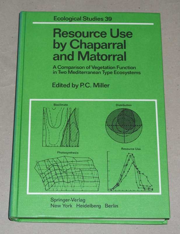 Miller, Philip C. [Hrsg.]: Resource use by chaparral and matorral. A comparison of vegetation function in 2 mediterranean type ecosystems. [1. Aufl.]. New York/Heidelberg/Berlin: Springer, 1981. 25 cm. XVIII, 455 S., 118 graph. Darst. Pp. Unteres Kapital gestaucht, sonst leichte Gebrauchsspuren. Ecological studies ; Vol. 39. Literaturverz. S. 409 – 433