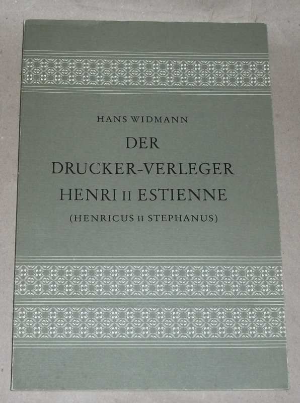 Widmann, Hans: Der Drucker-Verleger Henri II Estienne. (Henricus II Stephanus.) Mit einem Dankwort an Aloys Ruppel, den Begründer u. langjährigen Redaktor des Gutenberg-Jahrbuchs. [Vortrag]. Mainz: Gutenberg-Gesellschaft, 1970. gr. 8. 29 S. Engl. brosch. Leichte Gebrauchsspuren. Kleiner Druck der Gutenberg-Gesellschaft ; Nr. 87.