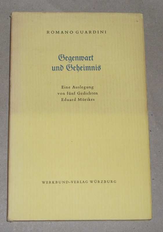 Guardini, Romano: Gegenwart und Geheimnis. Eine Auslegung von 5 Gedichten Eduard Mörikes. Mit einigen Bemerkungen über d. Interpretieren. 1. Aufl. Würzburg: Werkbund-Verl., 1957. 21 cm, 116 S. Ln., SU. SU. z.T. gebräunt / angeschmutzt u. mit Randläsuren. Notiz a. Vorsatz + Titel, Anstreichungen im Text. Sonst gut erhalten.