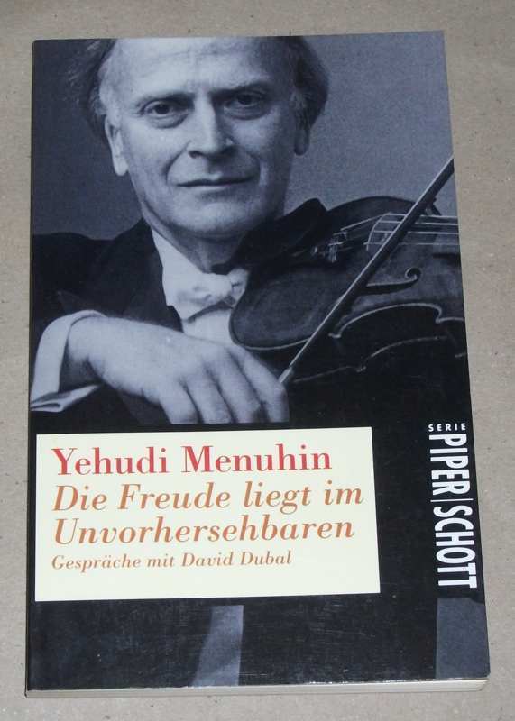Menuhin, Yehudi; Dubal, David: Die Freude liegt im Unvorhersehbaren. Gespräche mit David Dubal. Dt. Erstausg. München: Piper; Mainz : Schott, 1996. 19 cm. 191 S. TB. Rücken mit Knickspur vom lesen, Schnitt gebräunt. Sonst gut erhalten. Piper ; 2306.