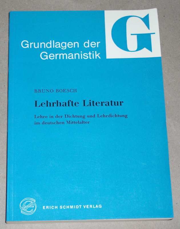 Boesch, Bruno: Lehrhafte Literatur. Lehre in der Dichtung u. Lehrdichtung im deutschen Mittelalter. Berlin: E. Schmidt, 1977. 21 cm. 293 S. Kart. Ecke / Einbandkante etw. bestoßen, Schnitt oben etw. angestaubt. Sonst leichte Gebrauchsspuren. Riecht etw. muffig. Grundlagen der Germanistik ; 21.