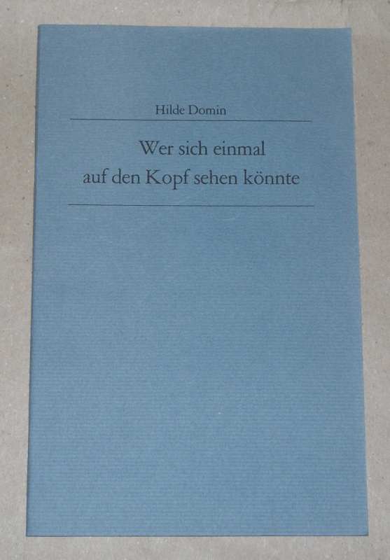 Domin, Hilde: Wer sich einmal auf den Kopf sehen könnte. Einführung zum Wettbewerb um den Leonce- und Lena-Preis 1979 und zur Lesung des Ehrengastes Karl Krolow. Darmstadt: Stadt Darmstadt 1980 23 cm, 18 S., Geheftet. Leichte Gebrauchsspuren.