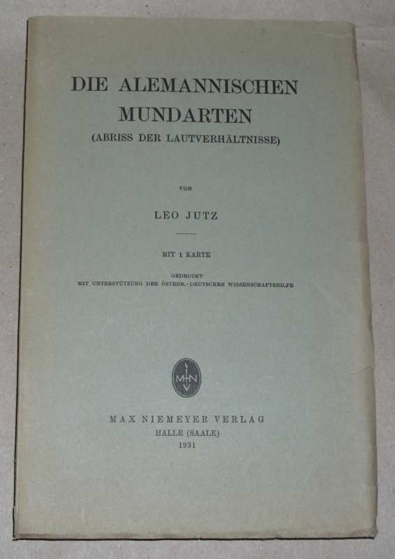 Jutz, Leo: Die alemannischen Mundarten (Abriss d. Lautverhältnisse). Halle: Niemeyer, 1931. gr. 8. XI, 289 S., Mit 1 Kt. Kart. Umschlag u. Schnitt gebräunt, Einbandkanten bestoßen / mit Randeinrissen. Unbeschnitten, Unaufgeschnitten. Riecht muffig.
