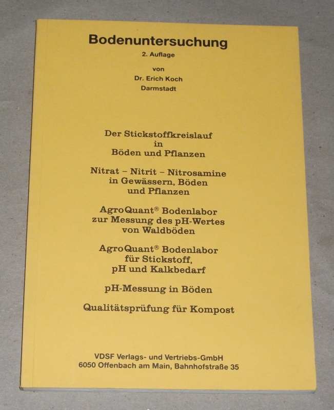 Koch, Dr. Erich: Bodenuntersuchung. 2. Aufl. Offenbach a.M.: VDSF Verlags- und Vertriebsgesellschaft 1987 20,5 cm, Kart. Oberer Schnitt braunfleckig. Sonst leichte Gebrauchsspuren.
