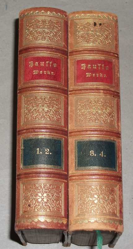 Hauff: Hauffs Werke in vier Bänden. 1. Band: Gedichte Novellen / 2. Band. Lichtenstein / 3. Band: Memoiren des Satan. Der Mann im Monde. / 4. Band: Märchen. Skizzen. 4 Bände in 2 Bänden. Leipzig: Th. Knaur o.J. 18 cm, HLdr. mit mamoriertem Schnitt. Einbände an den Kanten berieben. Jeweils EX-Libris auf Einband-Innenseite, Namens-Stempel im Vorsatz. Ex-Libris im Vorsatz entfernt (Reste). Sonst gut erhalten.