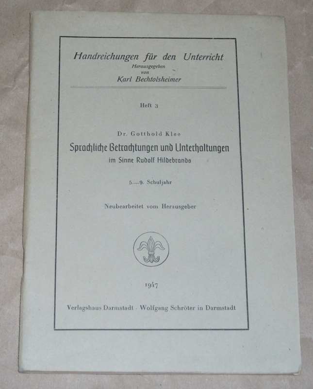 Klee, Gotthold: Sprachliche Betrachtungen und Unterhaltungen im Sinne Rudolf Hildebrands. 5.-9. Schuljahr. Darmstadt: Schröter, 1947. 21 cm, 64 S. Geheftet. Papier gebräunt. Gut erhalten. Handreichungen für den Unterricht, 3.