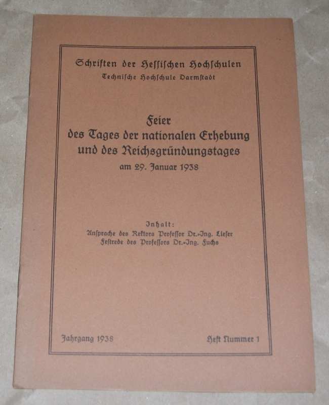 Technische Hochschule Darmstadt: Feier des Tages der nationalen Erhebung und des Reichsgründungstages am 29. Januar 1938. Festrede von Prof. Dr.-Ing. Otto Fuchs: Chemische Industrie als nationalwirtschaftlicher Faktor. Darmstadt: 1938 21 cm, 16 S., altdeutsche Schrift. Geheftet. Name a. Umschlag. Gut erhalten. Schriften der hessischen Hochschulen Technische Hochschule Darmstadt Jahrgang 1938 Heft Nr. 1.