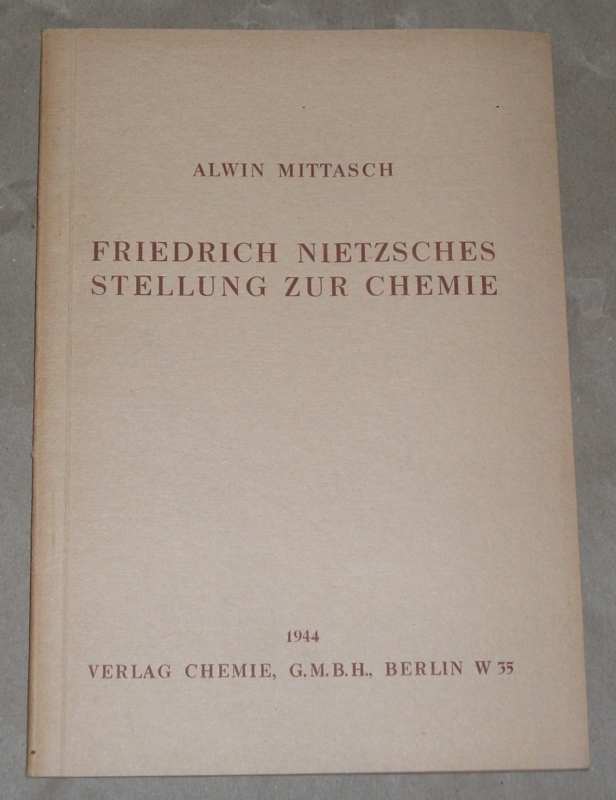 Mittasch, Alwin: Friedrich Nietzsches Stellung zur Chemie. Berlin: Verl. Chemie, 1944. 21 cm, 41 S. Heheftet. Umschlag u. Papier gebräunt. Mit handschriftlichem Vermerk: Mit besten Grüßen! im Vorsatz.