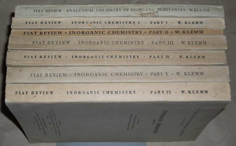 Klemm, Wilhelm: Inorganic Chemistry Part I – VI [1-6] komplett. 7 Bände. Wiesbaden: Dieterich´sche Verlagsbuchhandlung 1948 / 49 22 cm, Kart. Einbände / Schnitt gebräunt u. angestaubt / etw. angeschmutzt. Ecken etw. bestoßen. Fiat Review of German Science 1939-1946 Beiliegend: Klemm, Wilhelm: Analytical Chemistry of inorganic Substances. 1948. Fiat Review. Zustand mäßig, Block wohl durch Wasserschaden gewellt, Umschlag fleckig, geknickt und am Rücken etw. beschädigt. Die Seiten kleben nicht zusammen.