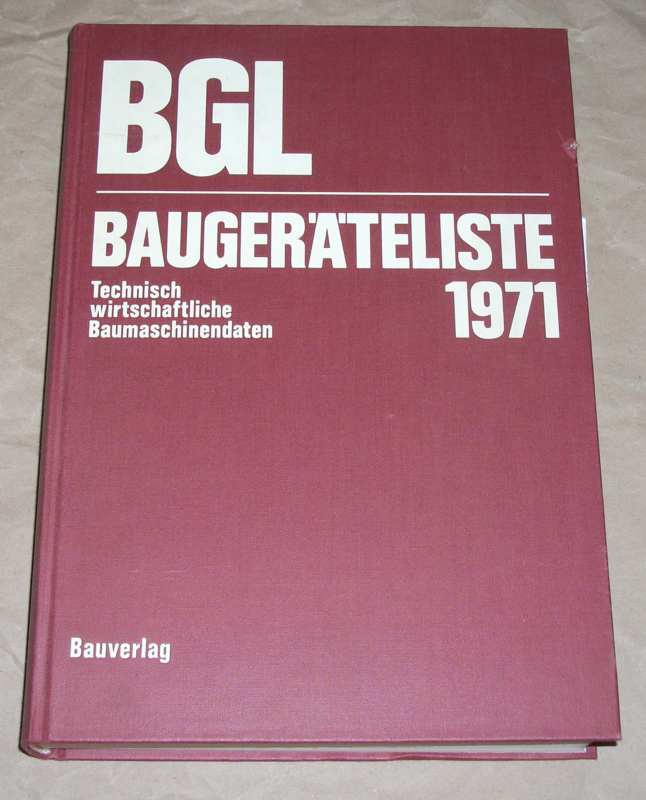 Hauptverband der deutschen Bauindustrie (Hrsg.): BGL. Baugeräteliste 1971. Technisch-wirtschaftliche Baumaschinendaten. Wiesbaden, Berlin: Bauverlag 1971 30 cm, XIX, 491 S. Ln. Einbandkante mit kl. Fehlstelle, Stempel a. V., sonst gut erhalten.