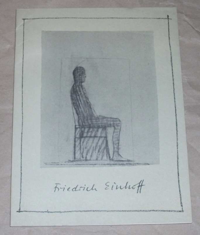 Hohl, Hanna (Einl.): Friedrich Einhoff. Zeichnungen, Bilder; Galerie Hauptmann Hamburg, 24. Februar – 16. April 1983. Hamburg: 1983. 27 cm, [40] Bl. überwiegend Ill. Kart., SU. Leichte Gebrauchsspuren. Mit handschriftlicher Widmung an Leo Leonhard auf dem Titelblatt und beiliegendem handschriftlichen Brief an ihn.