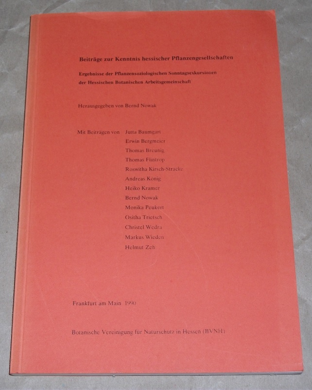 Nowak, Bernd (Hrsg.): Beiträge zur Kenntnis hessischer Pflanzengesellschaften. Ergebnisse der pflanzensoziologischen Sonntagsexkursionen der Hessischen Botanischen Arbeitsgemeinschaft. Frankfurt / M.: Botanische Vereinigung für Naturschutz in Hessen (BVNH) 1990 24 cm, 207 S. mit Tab. + 4 lose Beilagen in Einstecklasche an hinterer Einbandinnenseite. Broschur. Einband lichtrandig, Ecken etw. bestoßen. Gut erhalten.