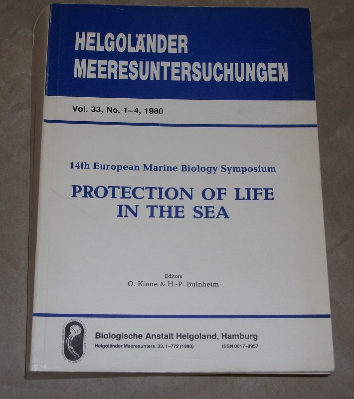 Kinne, Otto u. H.-P. Bulnheim [Hrsg.]: Protection of life in the sea. 14th European Marine Biology Symposium. Hamburg: Biologische Anstalt Helgoland 1980. 25 cm. 772 S., Ill., graph. Darst. Kart. Kapitale etw. bestoßen, Block schief, Schnitt gebräunt. Sonst gut erhalten. Helgoländer Meeresuntersuchungen ; Vol. 33. 1980, no. 1-4. ISSN: 0017-9957