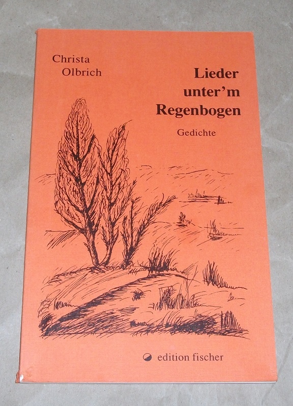 Olbrich, Christa: Lieder unter’m Regenbogen. Gedichte. Frankfurt (Main): R. G. Fischer, 1991. 21 cm. 69 S. Kart. Unteres Kapital etw. beschädigt. Einband mit knickspur ( wahrscheinlich vom reinschreiben der Widmung). Sonst gut erhalten. Edition Fischer. Mit handschriftlicher Widmung der Autorin im Vorsatz, datiert März 1996.