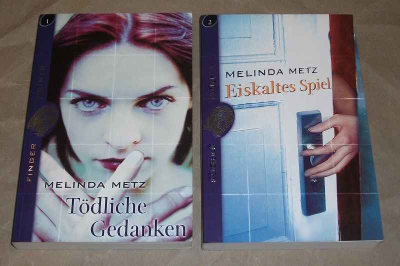 Metz, Melinda: Tödliche Gedanken / Eiskaltes Spiel. Finger-Prints Band 1 + 2. 2 Bände. München: Schneider, 2002. 20,5 cm, je 220 S. TBs. Band 1: Ecken gering bestoßen, Umschlagecke mit Knickspur.Schnitt gering angeschmutzt. Sonst leichte Gebrauchsspuren.
