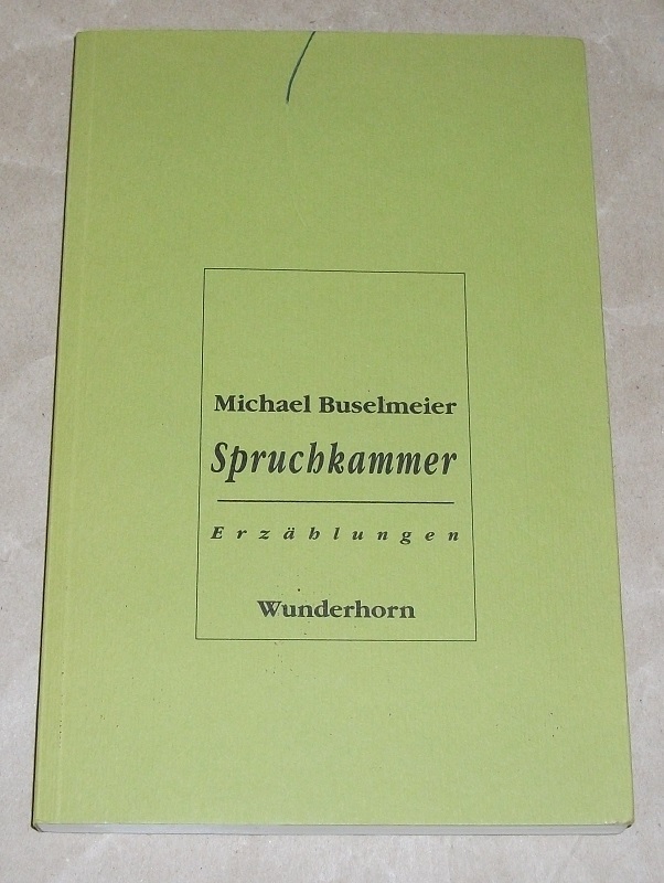 Buselmeier, Michael: Spruchkammer. Erzählungen. 1. Aufl. Heidelberg: Wunderhorn, 1994. 21 cm. 127 S. Klappenbroschur. Strich auf Einband / oberem Schnitt. Sonst leichte Gebrauchsspuren.