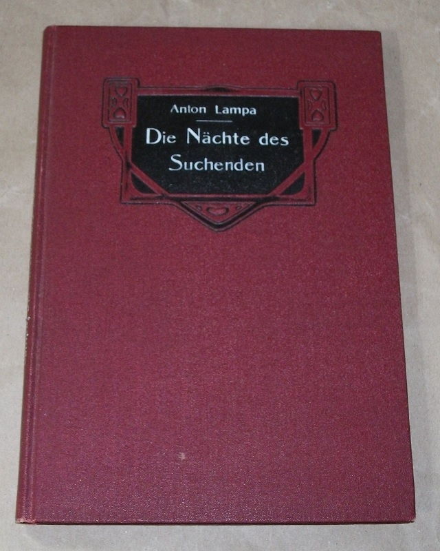 Lampa, Anton: Die Nächte des Suchenden. Das Erlösungsbedürfnis des Menschen und die doppelte Form seines Erkennens. Braunschweig: C. A. Schwetschke und Sohn 1893 21 cm. 115 S. Ill. Ln., Kopffarbschnitt. Einband gering fleckig und auf der Rückseite schwach lichtrandig. Schnitt gebräunt u. an der Seite wenige Seiten etw. unsauber geschnitten. Leichte Gebrauchsspuren.