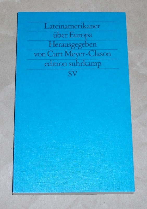 Meyer-Clason, Curt [Hrsg.]: Lateinamerikaner über Europa. Erstausg., 1. Aufl. Frankfurt am Main: Suhrkamp, 1987. 18 cm. 247 S. TB. Schnitt gebräunt. Preisangabe a.d. Rückseite überklebt. Leichte Gebrauchsspuren. Edition Suhrkamp ; 1428 = N.F., Bd. 428.
