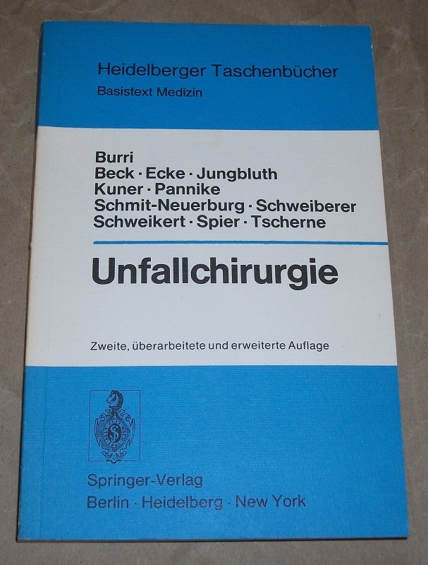 Burri, Caius [Mitarb.]: Unfallchirurgie. 2., überarb. u. erw. Aufl. Berlin, Heidelberg, New York: Springer, 1976. 21 cm. XX, 284 S., 144 Ill. u. graph. Darst. TB. Kanten am Rücken berieben, Einband u. Schnitt gebräunt / etw. fleckig. Sonst leichte Gebrauchsspuren. Heidelberger Taschenbücher ; Bd. 145 : Basistext Medizin. Mit 144 Abb. u. 10 Tab.