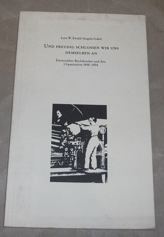 Ewald, Lutz W.; Gabel, Angela: Und freudig schlossen wir uns demselben an. Darmstädter Buchdrucker und ihre Organisation 1848 – 1854 ; ein Beitrag zur Frühgeschichte der Darmstädter Gewerkschaftsbewegung. 1. Aufl. Darmstadt: Georg-Büchner-Buchh, 1988. 23 cm. 47 S., Ill. Kart. Einband angeschmutzt, Ecken etw. bestoßen. Sonst gut erhalten. Literaturverz. S. 42 – 45 Nebent.: Darmstädter Buchdrucker 1848 – 1854