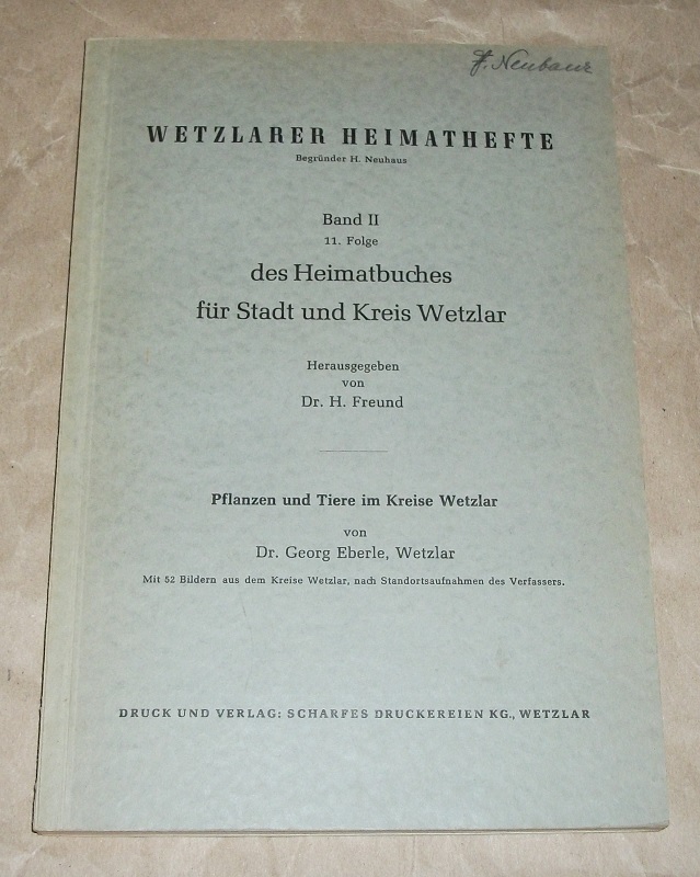 Eberle, Georg: Pflanzen und Tiere im Kreise Wetzlar. Wetzlar: Scharfe, ca. 1958. 23 cm, S. 75 – 166, [13] Bl. Ill. Kart. Einband u. Schnitt gebräunt. Name a. Umschlag. Rücken handschriftlich mit Eberle beschriftet. Wetzlarer Heimathefte, F. 11 = Bd. 2. Mit Widmung des Autors auf dem Titelblatt. Signiert.