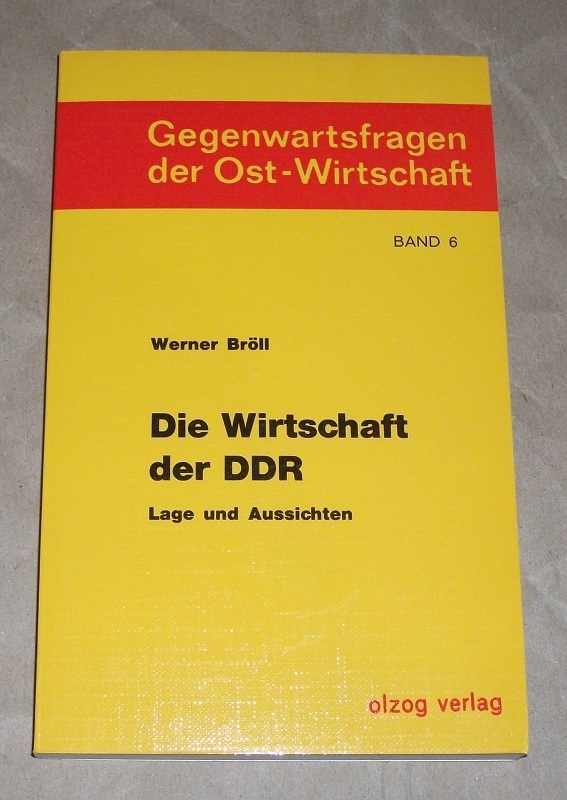 Bröll, Werner: Die Wirtschaft der DDR. Lage u. Aussichten. 2., überarb. Aufl. München, Wien: Olzog, 1973. 20 cm. 194 S., 1 graph. Darst. TB. Name a. V., Schnitt etw. gebräunt. Leichte Gebrauchsspuren. Gegenwartsfragen der Ost-Wirtschaft ; Bd. 6. Literaturverz. S. 148 – 150.