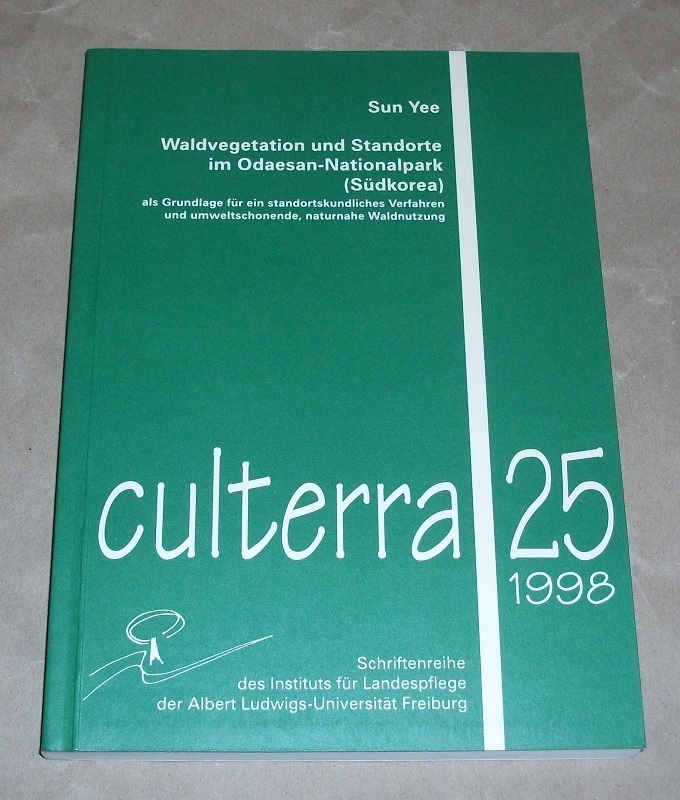Yee, Sun: Waldvegetation und Standorte im Odaesan-Nationalpark (Südkorea) als Grundlage für ein standortskundliches Verfahren und umweltschonende, naturnahe Waldnutzung. Freiburg i. Breisgau: Inst. für Landespflege, 1998. 21 cm. 182 S., Ill., graph. Darst., Kt. Kart. Leichte Gebrauchsspuren. Culterra ; 25.