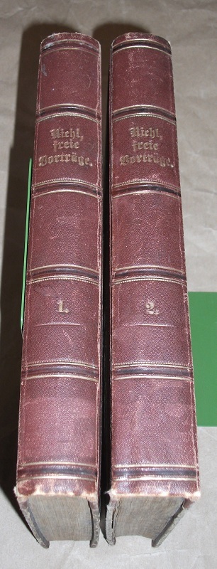 Riehl, Wilhelm Heinrich: Freie Vorträge. Erste und zweite Sammlung. 2 Bände. Stuttgart: J.G.Cotta’sche Buchhandlung, 1873 / 1885. 22 cm, XIV, 475 / X, 532 S., altdeutsche Schrift. HLn. Einbände / Kanten stärker berieben, Kapitale / Ecken bestoßen. Schnitt gebräunt. Vor allem Vorsätze u. Titel braunfleckig u. diese mit Nr. / Stempel.