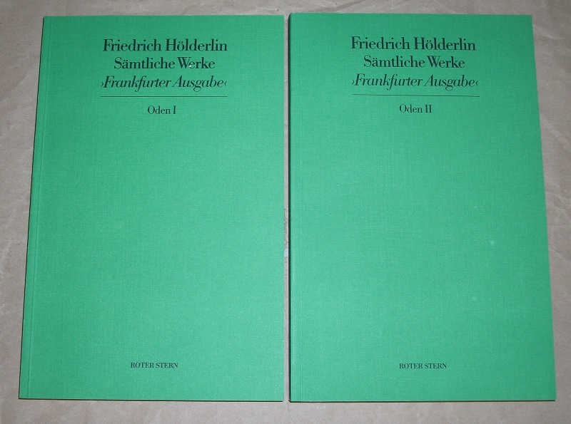 Hölderlin, Friedrich: Sämtliche Werke. Band 4 + 5. Oden I + II. „Frankfurter Ausgabe“, historisch-kritische Ausgabe / hrsg. von D. E. Sattler. [Hrsg. im Auftr. des Vereins zur Förderung der Wissenschaftlichen Forschung in der Freien Hansestadt Bremen e.V.]. 1. Aufl. 2 Bände. Frankfurt, M.: Roter Stern, 1984. 30 cm. zus. 851 S., Ill. Kart. im Schuber. Die Bände Schnitt gering fleckig. Leichte Gebrauchsspuren. Band 5: Umschlag vorne leicht fleckig.
