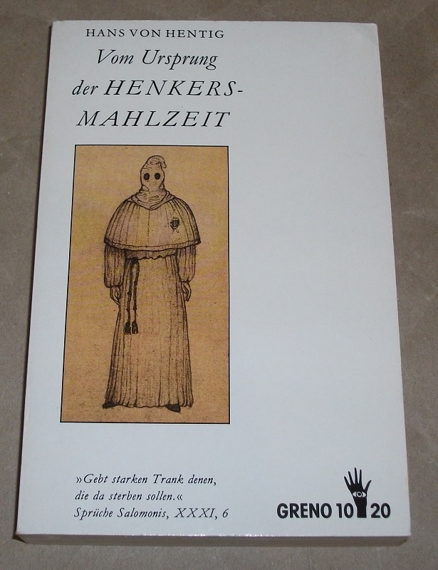 Hentig, Hans von: Vom Ursprung der Henkersmahlzeit. 1. Aufl. Nördlingen: Greno, 1987. 19 cm. 276 S. TB. Schnitt gebräunt, Einbandecke mit Knickspur. Sonst leichte Gebrauchsspuren. Greno 10, 20 ; 65. Lizenzausg. d. Verl. Mohr, Tübingen