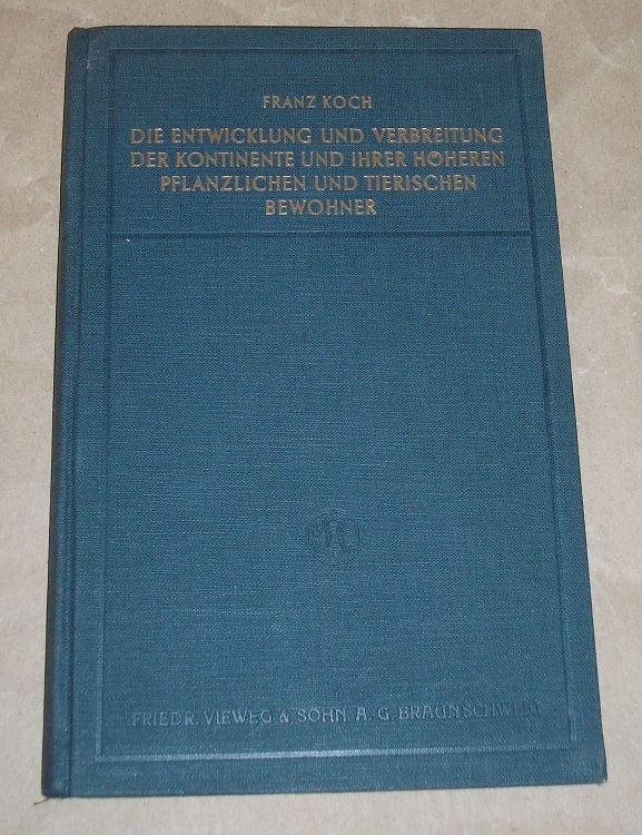 Koch, Franz: Die Entwicklung und Verbreitung der Kontinente und ihrer höheren pflanzlichen und tierischen Bewohner. Braunschweig: Vieweg, 1931. 8. VII, 96 S., 21 Abb. im Text u. auf Taf. Ln. Einband am Rücken etw. verblichen u. etw. verkratzt / fleckig. Schnitt etw. gebräunt. Sonst leichte Gebrauchsspuren.