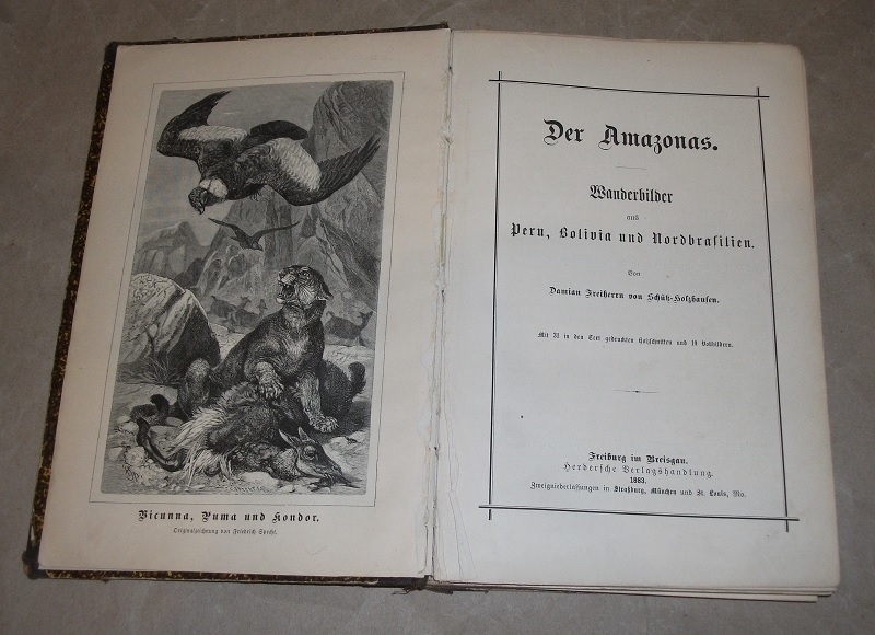 Schütz-Holzhausen, Damian von: Der Amazonas. Wanderbilder aus Peru, Bolivia und Nordbrasilien. Freiburg i. Br., Herder, 1883 8. XV, 243 S., mit 31 in den Text gedruckten Holzschnitten und 10 Vollbildern. HLn. Starke Gebrauchsspuren. Rücken fehlt, Einband stark berieben, Ecken bestoßen. Seiten / Tafeln z.T. lose / gelockert aber komplett. Schnitt gebräunt. Einzelne Anmerkungen mit bleistift am Seitenrand. Seitenecken z.T. mit Knickspur. Illustrierte Bibliothek der Länder- und Völkerrkunde. In Fraktur