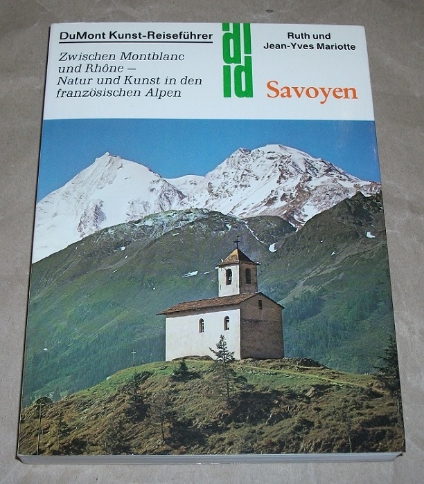 Mariotte, Ruth; Mariotte, Jean-Yves: Savoyen. Zwischen Montblanc und Rhône – Natur und Kunst in den französischen Alpen. 3., Aufl. Köln: DuMont, 1989. 21 cm. 258 S., Ill., Kt. Klappenbroschur. Rücken mit Knickspur vom lesen, Name a. T. Sonst leichte Gebrauchsspuren. DuMont-Dokumente : DuMont-Kunst-Reiseführer.