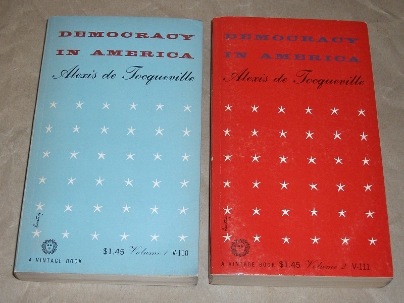 Tocqueville, Alexis de: Democracy in America Volume I + II. The Henry Reeve text as rev. by Francis Bowen, now further corr. and ed. with a historical essay, ed. notes, and bibliographies by Phillips Bradley. 2 Bände. New York: Vintage Books. (1945) 18,5 cm, XVI, 452, XI / XII, 518, IX S. TB. s. Einbände etw. berieben, Ecken etw. bestoßen, Band 2 mit Knickspur. Schnitte gebräunt. Beide Bände am Anfang vom unteren Schnitt her etw. wasserrandig, Seiten etw. gewellt – kleben nicht aneinander. Sonst gut erhalten.