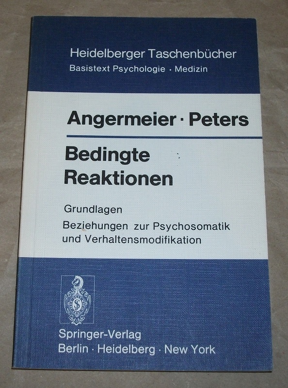 Angermeier, Wilhelm F.; Peters, Michael: Bedingte Reaktionen. Grundlagen; Beziehungen z. Psychosomatik u. Verhaltensmodifikation. Berlin, Heidelberg, New York, Springer, 1973. 21 cm. XI, 204 S., 44 graph. Darst. Kart. Name auf hinterer Einband-Innenseite, etw. gebräunt, wenige Anstreichungen. Sonst leichte Gebrauchsspuren. Heidelberger Taschenbücher ; Bd. 138 : Basistext Psychologie; Medizin. Auf d. Umschlag: Angermeier-Peters. – Literaturverz. S. 187 – 195.