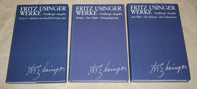 Usinger, Fritz: Werke. Friedberger Ausgabe Bände 1, 3, 4. Das Wort Die Stimmen Die Geheimnisse / Hermes Das Glück Niemandsgesang / Essays I Aufsätze aus den Jahren 1939 – 1955. 3 Bände. Waldkirch: Waldkircher Verl.-Ges., 1984 / 85. 22 cm, 195 / 145 / 186 S. Pp., SU. Leichte Gebrauchsspuren. Ein Band oberes Kapital bestoßen.