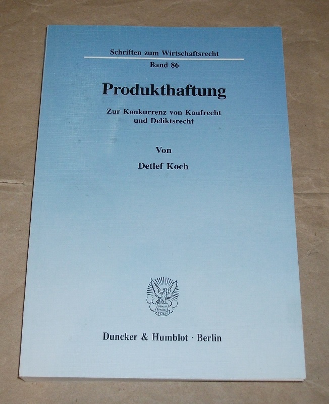 Koch, Detlef: Produkthaftung. Zur Konkurrenz von Kaufrecht und Deliktsrecht. Berlin: Duncker und Humblot, 1995. 24 cm. 393 S., graph. Darst. Kart. Einband fleckig, etwas schief gelesen, Ecken etw. bestoßen, sonst gut erhalten. Schriften zum Wirtschaftsrecht ; Bd. 86. Mit Widmung des Autors im Vorsatz.