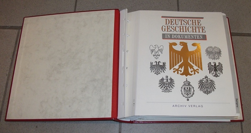 Deutsche Geschichte in Dokumenten. 9 Sammelordner mit Lieferungen. O 1: 00112:Urkundenlehre Mittelalter; Blatt Anhang; 9807:Deutsche Geschichte im Kartenbild; 09908: Stammtafeln deutscher Herrscherhäuser; 00203: Vom Hexenwahn zur Hexenverfolgung, 12. Jhd. bis 18. Jhd.; Deckblatt; 00003 :Besitzurkunde Nr. 2217; 00002: Grussworte; 00001:Vorwort; 00012: IX. und X. Jhd; 00009: Kaiserkrönung Karls des Großen in Rom 25. Dez. 800; 00109: Ludwig der Fromme und die Reichsordnung von 817; 09606: Kaiser Otto der Große 968; 00012: XI. und XII. Jhd; 00114: Die Gründung des Bistums Bamberg 1007; 09609: Heinrich der Löwe und Friedrich Barbarossa 1154; 09901: Der Friede von Venedig 1177; 09810: Kaiser Heinrich VI. und die Eroberung Siziliens 1194; O 2: 00012: XIV. Jhd; 09909: Der Kurverein von Rhense 1338; 00002: Der „Schwarze Tod“ 1347; 09805: Die Gründung der Universität Prag 1348; 09713: Die goldene Bulle 1356; 09608: Die Hanse und Dänemark 1370; 09613: Der Landfrieden von Eger 1389; 00012: XIII. Jhd; 00204: Die Ermordung Philipps von Schwaben 1208; 00104: Kaiser Friedrich II. und die deutschen Fürsten 1220; 09703: Der Deutsche Orden und Friedrich II. 1226; 00111: Der „Sachsenspiegel“ Eikes von Repgow ca. 1224 bis 1233; 00107: Die Gründung des Rheinischen Bundes 1254; 09502: König Rudolf I. von Habsburg 1282; O 3: 00012: XV. Jhd.; 09708: Leipzig auf dem weg zur Reichsmesse 1497; 09912: Die sächsische Hauptteilung von 1485; 09812:Die Handregistratur Friedrichs III. 1446; 00004: Johannes Gutenberg 1440; 09506: Die Reichskleinodien 1424; 09710: Ruprecht von der Pfalz und Wenzel 1400; O 4: 00012: XVI. Jhd; 00202: Das Bild der deutschen Stadt im 16. Jhd; 09914: Der Reichstag zu Augsburg 1530; 09902: Die erste Wiener Türkenbelagerung 1529; 00206: Bauernkrieg und Reformation 1525; 09711: Franz von Sickingen und die Reichsritter 1522; 09814: Thomas Müntzer 1521; 09612: Die Fugger und die deutsche Königswahl 1519; 00102: Kaiser Maximilian I. und sein „Weisskunig“ 1514; 00003: Die Deutschen und der Indienhandel um 1500; O 5: 00012: XVII. Jhd; 09802: August der Starke 1697; 09709: Die Hugenotten in Deutschland 1685; 09702: Die Türken vor Wien 1683; 00105: Brandenburg in Afrika 1681; 09813: Ludwig XIV., das Reich und die Reunionen 1681; 09611: Friedrich Wilhelm. Der große Kurfürst 1675; 09804: Der Westfälische Frieden 1648; 00110: Die Ermordung Wallensteins 1634; 00013: Magdeburgs Wiederaufbau nach 1631; 09910: Die Schlacht am weißen Berg 1620; O 6: 00012: XVIII. Jhd; 00101: Die Krönung Friedrichs I. 1701; 00205: Die Schlacht bei Höchstädt 1704; 09907: Friedrich und Katte 1730; 00008: Der Erste und Zweite Schlesische Krieg 1740 – 1745; 00014: Der Friede zu Hubertusburg 1763; 00006: Das Politische Testament Friedrichs des Großen 1768; 09911: Goethe und die Kanonade von Valmy 1792; O 7: 00012: XIX. Jahrhundert; 00113: Die Schlacht bei Jena und Auerstedt 1806; 00005: Das Kommunistische Manifest 1848; 09707: König Ludwig I. von Bayern 1848; 09803: Das Revolutionsjahr 1848; 09504: Der Weg zur Paulskirche 1848; 00001: Der Orden Pour le mérite für Wissenschaften und Künste 1842; 09712: Das Deutschlandlied 1841; 09809: Deutschlands erste Dampf-Eisenbahn 1835; 09706: Das Hambacher Fest 1832; 09904: Das Wartburgfest 1817; 09903: Der Deutsche Bund 1815; 09607: Die Völkerschlacht bei Leipzig 1813; 00007: Heinrich Friedrich Karl Reichsfreiherr von und zu Stein 1807; 09806: Das Ende des Römischen Reiches 1806; 00106: Der Reichsdeputationshauptschluß 1803; O 8: 09808: Otto von Bismarck 1898; 09701: Bismarcks Entlassung 1890; 096AL: Die Gründung des Deutschen Reiches 1871; 00103: Die Emser Depesche 1870; 09704: Die Schlacht bei Königgrätz 1866; 09801: Der Deutsch-Dänische Krieg 1864; O 9: 00012: XX. Jhd; 00011: Die Deutsche Einheit 1990; 09913: Mauerbau und Mauerfall 1961 / 1989; 09905: Die Gründung der Bundesrepublik Deutschland 1949; 09811:Der Weg zur Währungsreform 1947 /48; 09610: Kriegsende in Berlin und München 1945; 00108: Der Deutsche Widerstand 1944; 00010: Der Anschluß Österreichs 1938; 09705: Die Reichstagswahl 1928; 09906: Der Versailler Vertrag 1919; 00207:Die Abdankung Kaiser Wilhelms II. 1918; 00201: Der Hauptma 9 Bände. Archiv Verlag 29 cm, jede Lieferung Doppelblatt mit Dokumententasche und Faksimiles von Dokumenten / Fotos / Siegeln… Rote Kunstleder-Sammelordner. Insgesamt leichte Gebrauchsspuren / gut erhalten. wenige Lieferungen an den Ecken bestoßen. Mit allen Beilagen.
